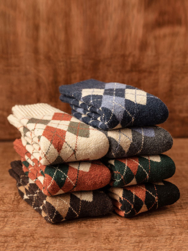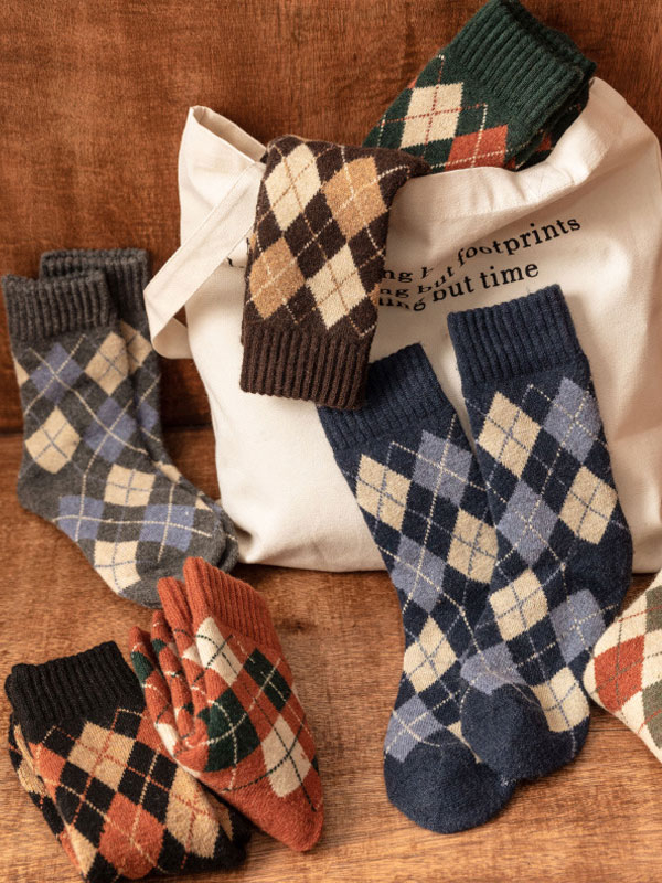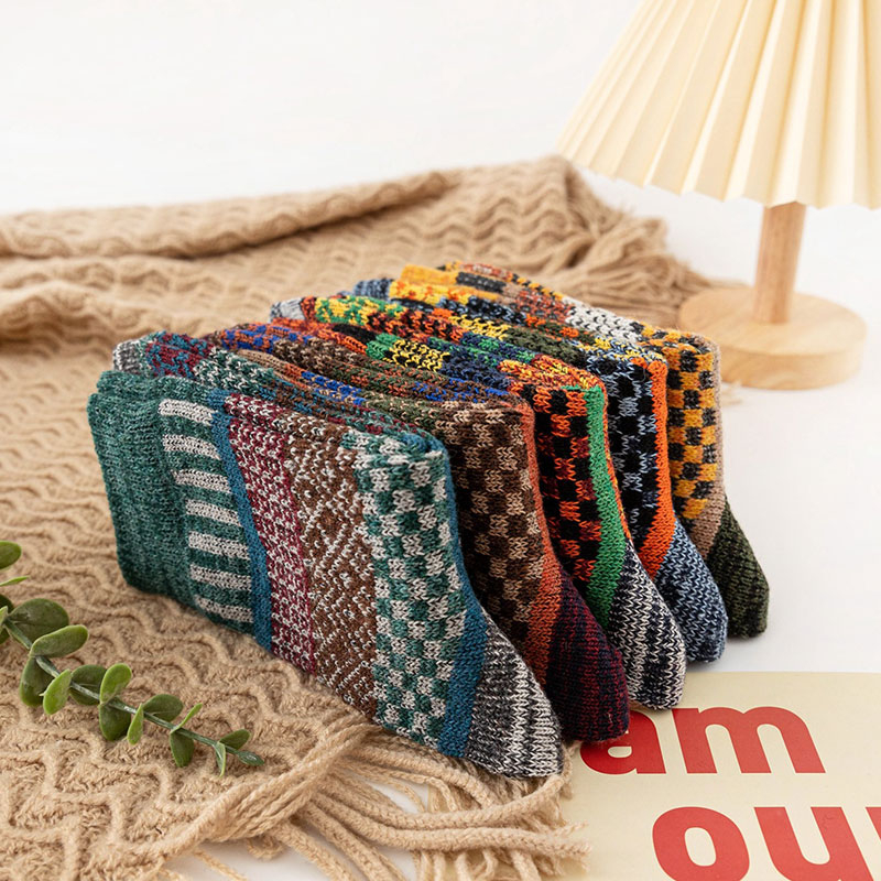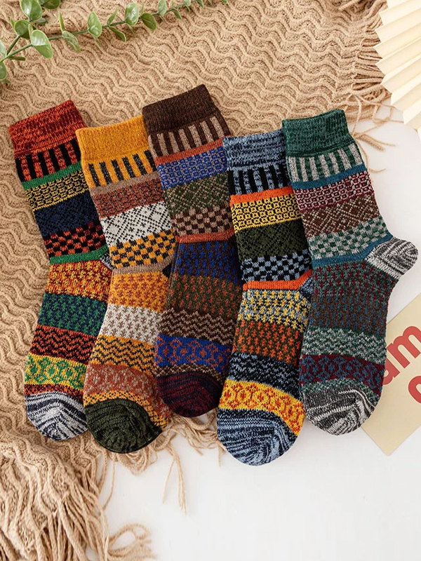 Thick-lined Diamond-patterned Ethnic Style Mid-calf Five Pairs Socks